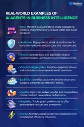 - Instead of just showing that customer churn is rising, an AI agent could trigger a workflow that identifies at-risk accounts and drafts retention emails.