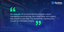 - AI helps in QA by analyzing large sets of test results and generating insightful reports that highlight issues and trends in the data.